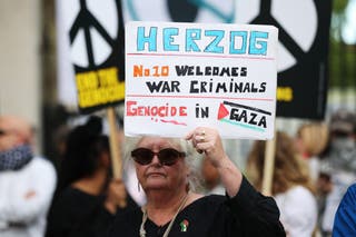 “Isaac Herzog genocide defender is not welcome here!” There was a sign that wrote, and the others called “Keir Starmer Smaze You”.