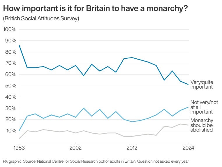 According to Natcen’s latest survey, one -third (31 percent) felt that the monarchy was not important in 1983 from one of the 10 in 1983.